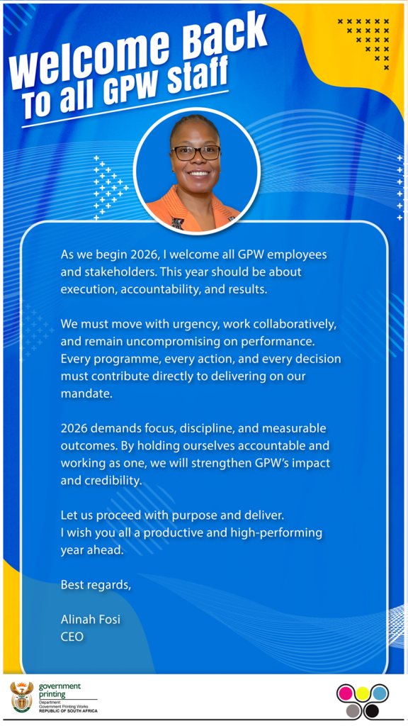 It is with extreme pleasure that on behalf of the Government Printing Works’ (GPW) Executive Committee (EXCO), I extend season’s greetings to all of our employees and stakeholders of GPW.